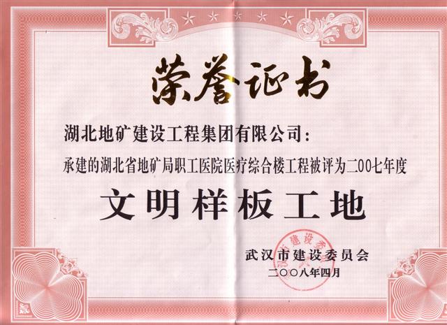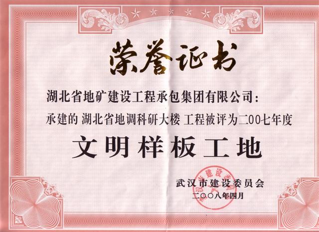 湖北地建地調大樓項目部和職工醫院項目部充分貫徹我院把項目現場安全文明施工管理作為打造“湖北地建”品牌的窗口的要求,以嚴格的現場管理水平、良好的施工技術質量與近日同時榮獲 “2007年度武漢市建筑工程文明樣板工地”稱號;地調大樓項目經理李彥同志和職工醫院項目經理分別榮獲“文明施工管理優秀項目經理”。