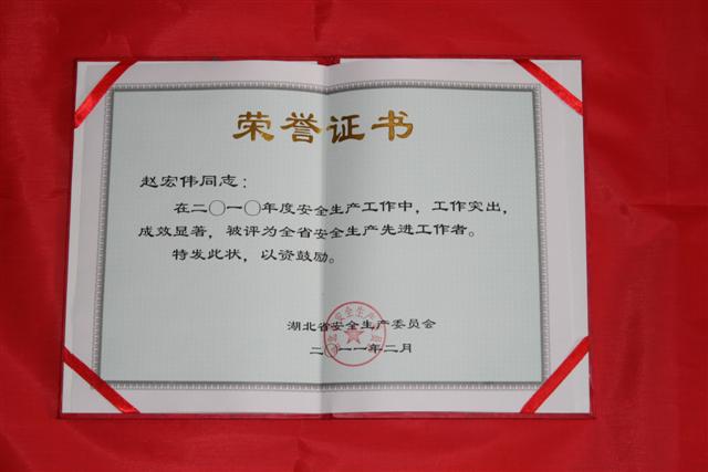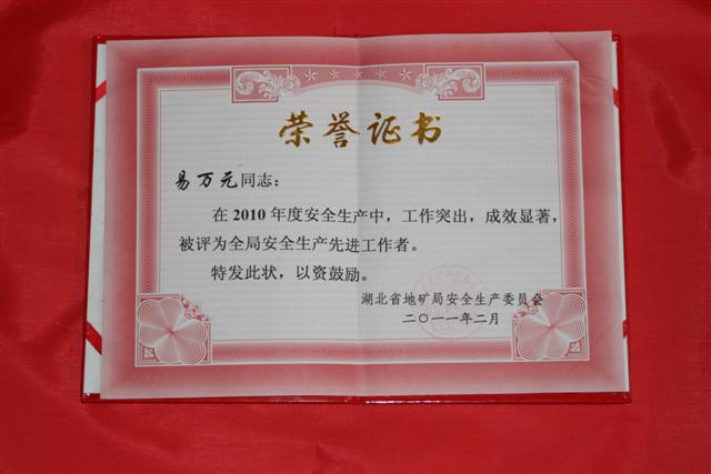 2011年3月4日,省地礦局召開(kāi) 2011年安全生產(chǎn)工作會(huì)議。會(huì)議對(duì)省、局安全生產(chǎn)先進(jìn)單位和個(gè)人進(jìn)行了獎(jiǎng)勵(lì)。武基公司榮獲“省地礦局2010年度安全生產(chǎn)先進(jìn)單位”,公司總經(jīng)理易萬(wàn)元被評(píng)為“省地礦局安全生產(chǎn)先進(jìn)工作者”,獲“全省安全生產(chǎn)先進(jìn)工作者”稱號(hào)的武基公司安全科長(zhǎng)趙宏偉還以《履行安全生產(chǎn)管理職責(zé),做一名合格的安全生產(chǎn)“守衛(wèi)者”》為題在大會(huì)上作了安全工作經(jīng)驗(yàn)交流。