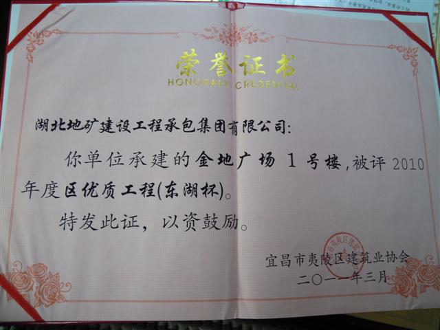 2011年3月31日,夷陵區住房與城鄉建設局召開了住建系統2011年度工作會議。會議對2010年度先進單位和個人進行了獎勵。由湖北地礦建設工程承包公司承建的金地廣場1#樓項目被評為“區文明施工現場”“區優質結構”“區優質工程(東湖杯)”,并被推薦為省優質工程(楚天杯)項目,鄧繼國被評為區“優秀項目經理”。夷陵區住房與城鄉建設局黨組書記、局長覃萬橋,黨組副書記、副局長何光林,副局長王同林、萬平等領導出席會議并為獲獎單位頒獎。