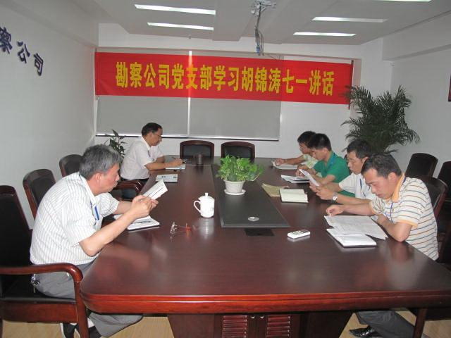 2011年7月12日,勘察公司黨支部召開生活會,學習胡錦濤總書記在慶祝中國共產黨成立90周年大會上的重要講話精神。在學習中,公司黨員干部重溫了黨的光輝歷程,對“沒有共產黨就沒有新中國” 有了更加深刻的認識。大家紛紛表示,今后要更自覺地以一名黨員的標準要求自己,廉潔自律,全心全意為職工謀福利,為集團的二次創業作貢獻,努力開創勘察公司的美好明天。