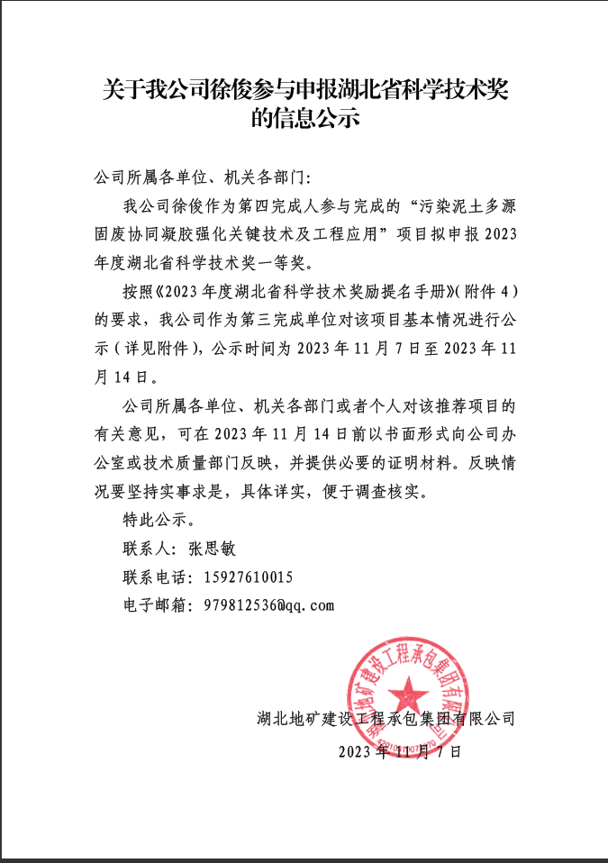 關(guān)于我公司徐俊參與申報(bào)湖北省科學(xué)技術(shù)獎的信息公示